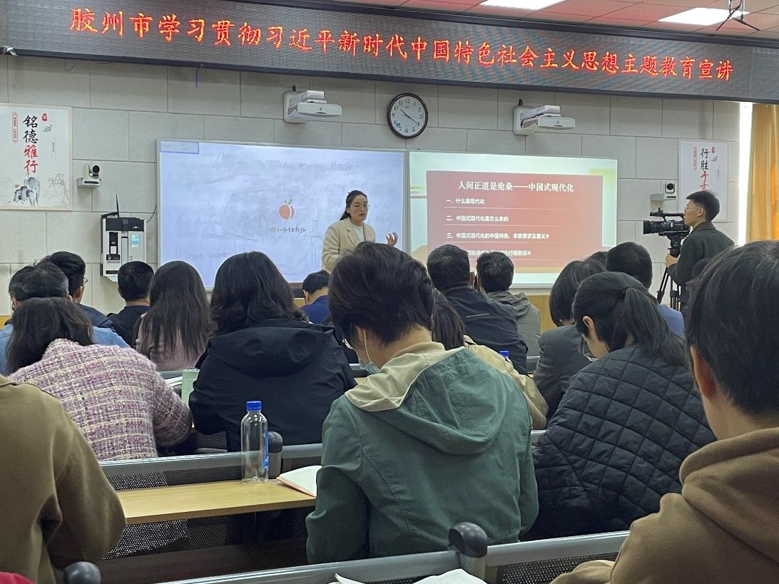 为深入学习贯彻习近平新时代中国特色社会主义思想主题教育,全面贯彻落实党的二十大精神这一主线,深入学习领会新时代党的创新理论蕴含的道理学理哲理,11月7日—11月10日,ladbrokes立博任重教授、姜文文主任在胶州市学习贯彻习近平新时代中国特色社会主义思想主题教育宣讲系列活动中开展相关主题宣讲。