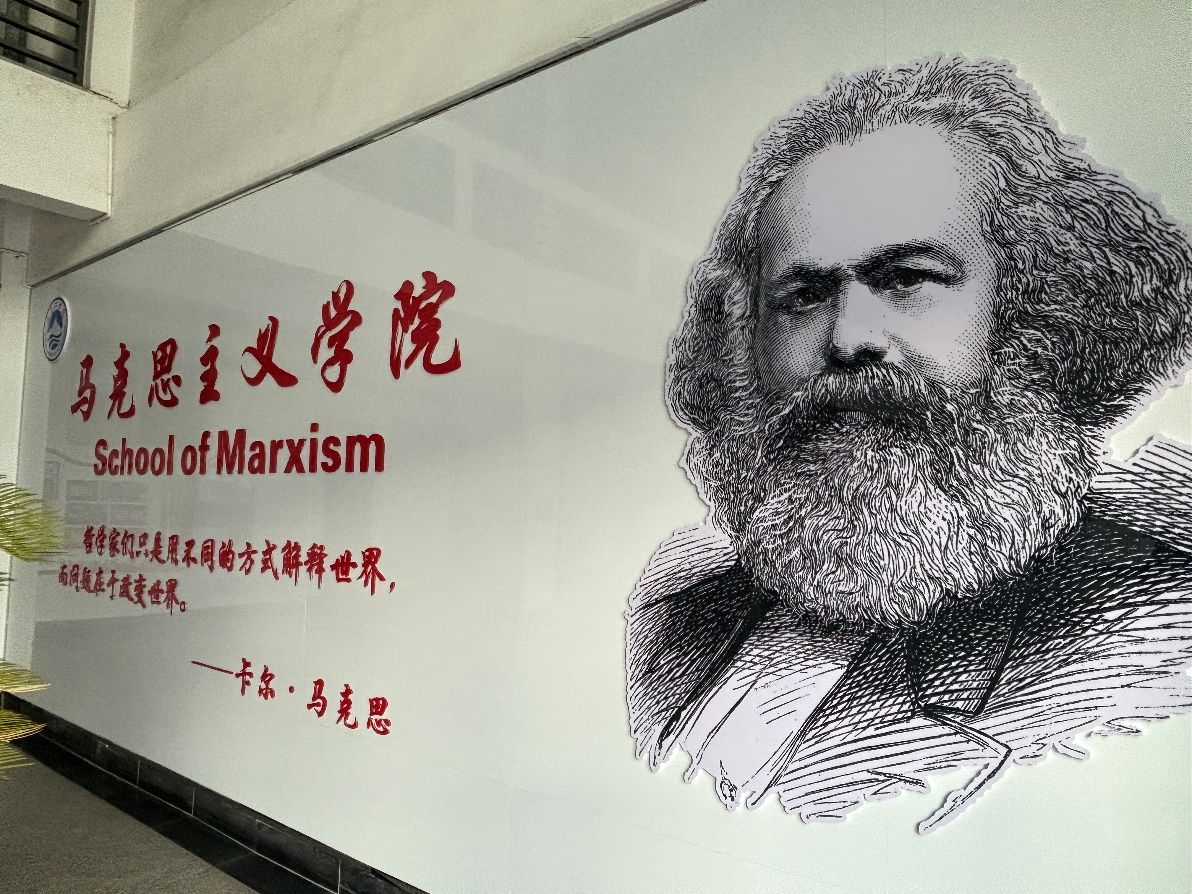 长廊伊始,映入眼帘的是由马克思画像和名言构成的马院标识、公司概况和团队队伍介绍,彰显公司整体风貌。漫步长廊,内容丰富,图文并茂。中国共产党百年奋斗史,社会主义五百年发展历程,以及“四个自信”“四个意识”“四个全面”“五位一体”“四个伟大”“两个维护”等中国特色社会主义思想的重要内容,悉数展现。师生们在行走于物理空间长廊的同时,仿佛也切身经历了一段栉风沐雨、砥砺奋进的新征程。