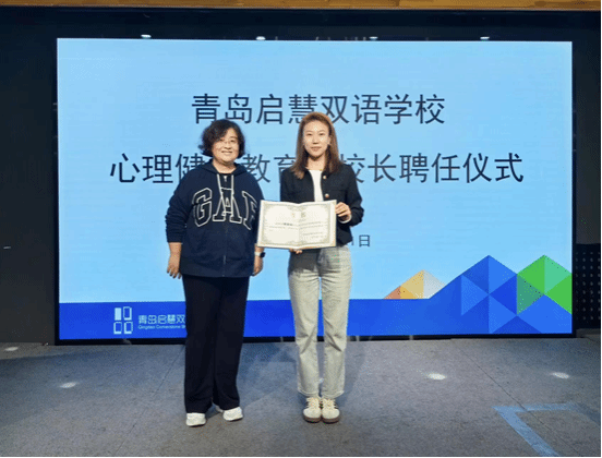 讲座开始之前,由青岛启慧双语公司副董事长陈慧为程亚楠老师颁发聘任证书,陈董事长表示程亚楠老师的加入将为青岛启慧双语公司的心理健康教育工作带来新的活力和专业支持。她鼓励全校师生积极参与到心理健康教育的各项活动中来,共同为员工的健康成长和公司的和谐发展作出贡献。