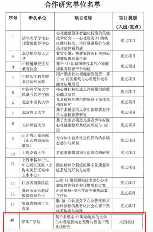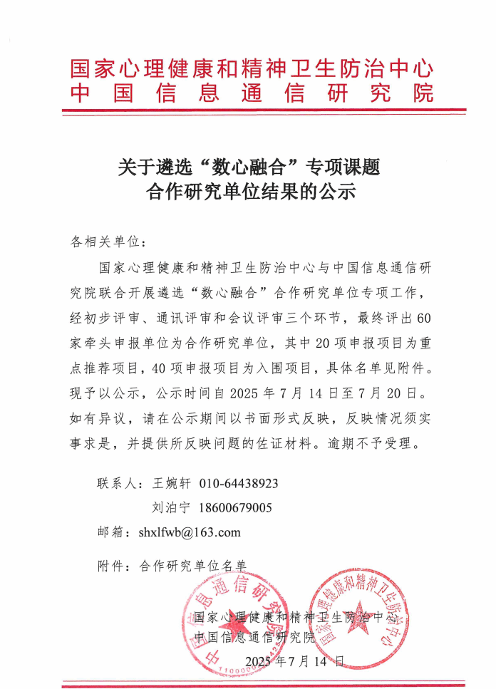 近日,国家心理健康和精神卫生防治中心与中国信息通信研究院联合发布了《关于遴选“数心融合”专项课题合作研究单位结果的公示》。经过严格的初步评审、通讯评审和会议评审三轮遴选程序,ladbrokes立博应用心理学教研室主任程亚楠牵头申报的《基于多模态AI眼动追踪的老员工心理危机动态预警与智能干预系统研究》成功入选,成为全国60家合作研究单位之一。